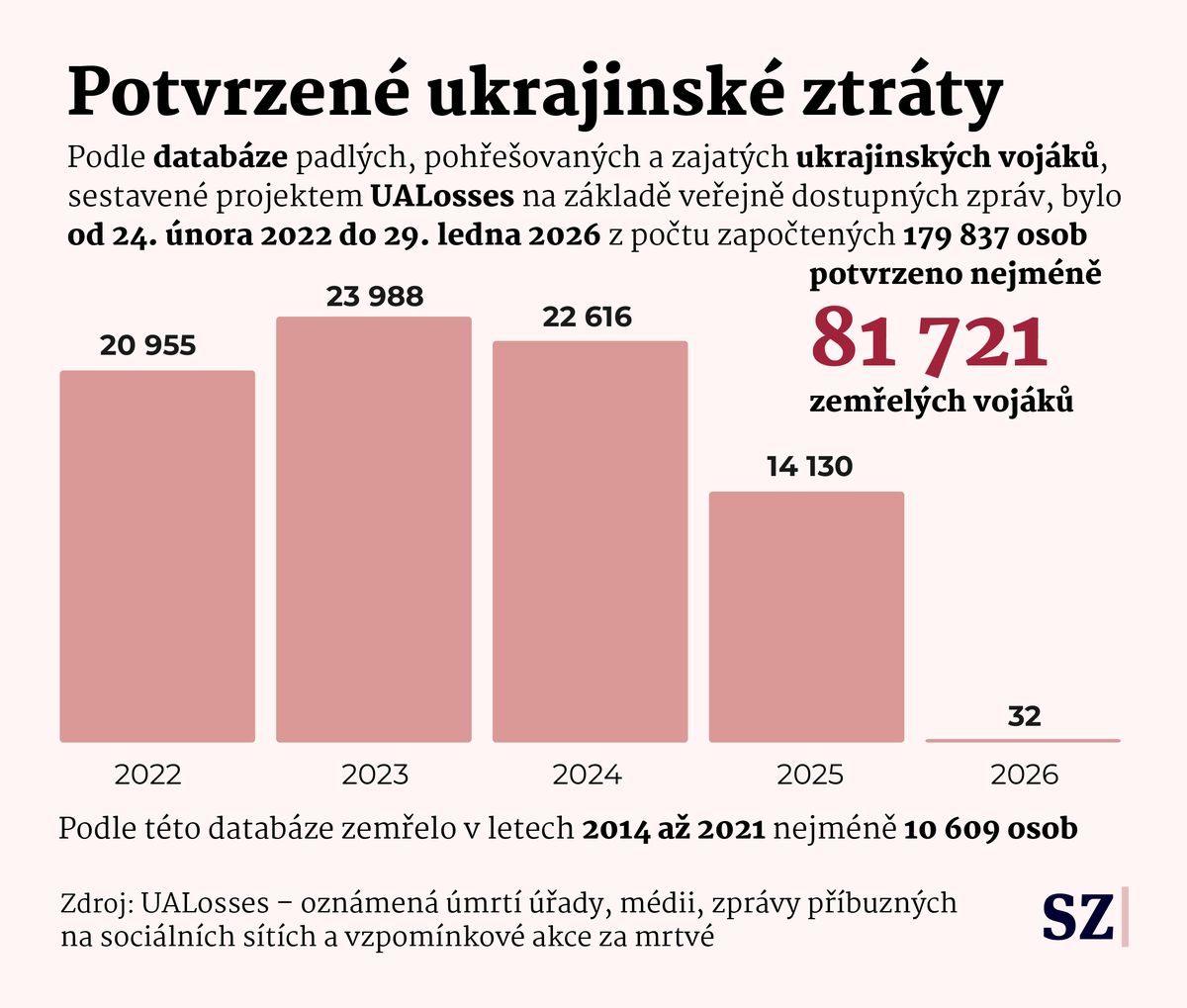 Ukrajinské ztráty v letech 2022 až 2026 podle databáze projektu UALosses.