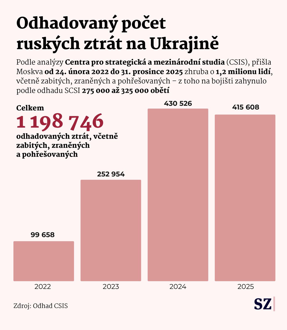 Odhad ruských ztrát na Ukrajině v letech 2022 až 2025 podle analýzy Centra pro strategická a mezinárodní studia (CSIS).