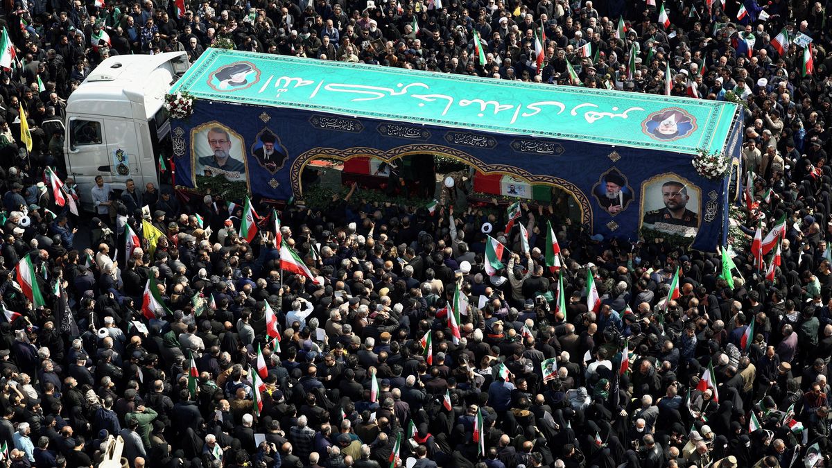 Lidé se shromáždili na pohřbu šéfa íránské Nejvyšší rady národní bezpečnosti Alího Larídžáního, 18. března 2026