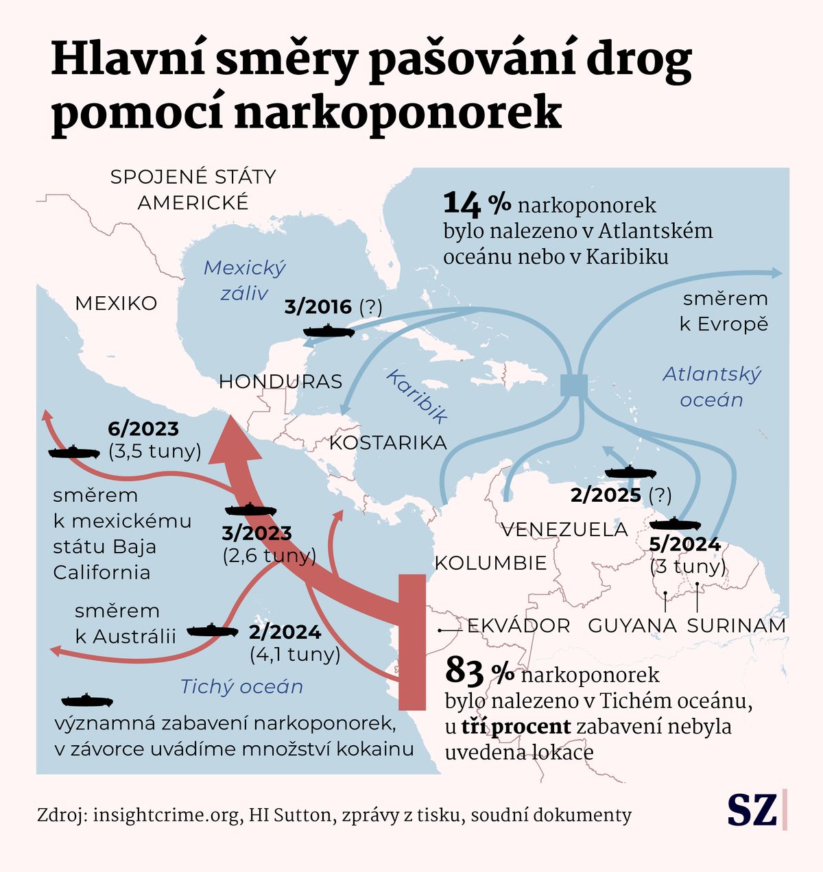 Dosud známé trasy, kterými v oceánech putují náklady kokainu v narkoponorkách.