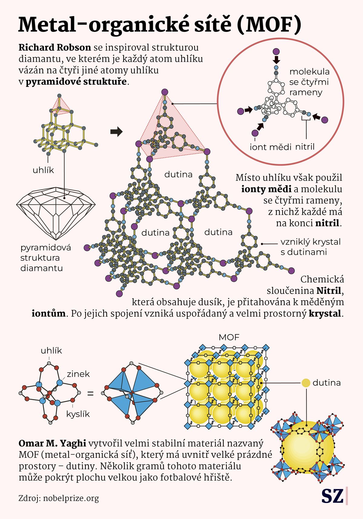 Letošní cena putuje ke třema klíčovým postavám, které tento obor postupně zformovaly. Richard Robson v 80. letech položil základy, když se inspiroval strukturou diamantu a jako první navrhl a syntetizoval trojrozměrnou síť z kovových a organických jednotek. Jeho práce byla koncepčním průlomem.