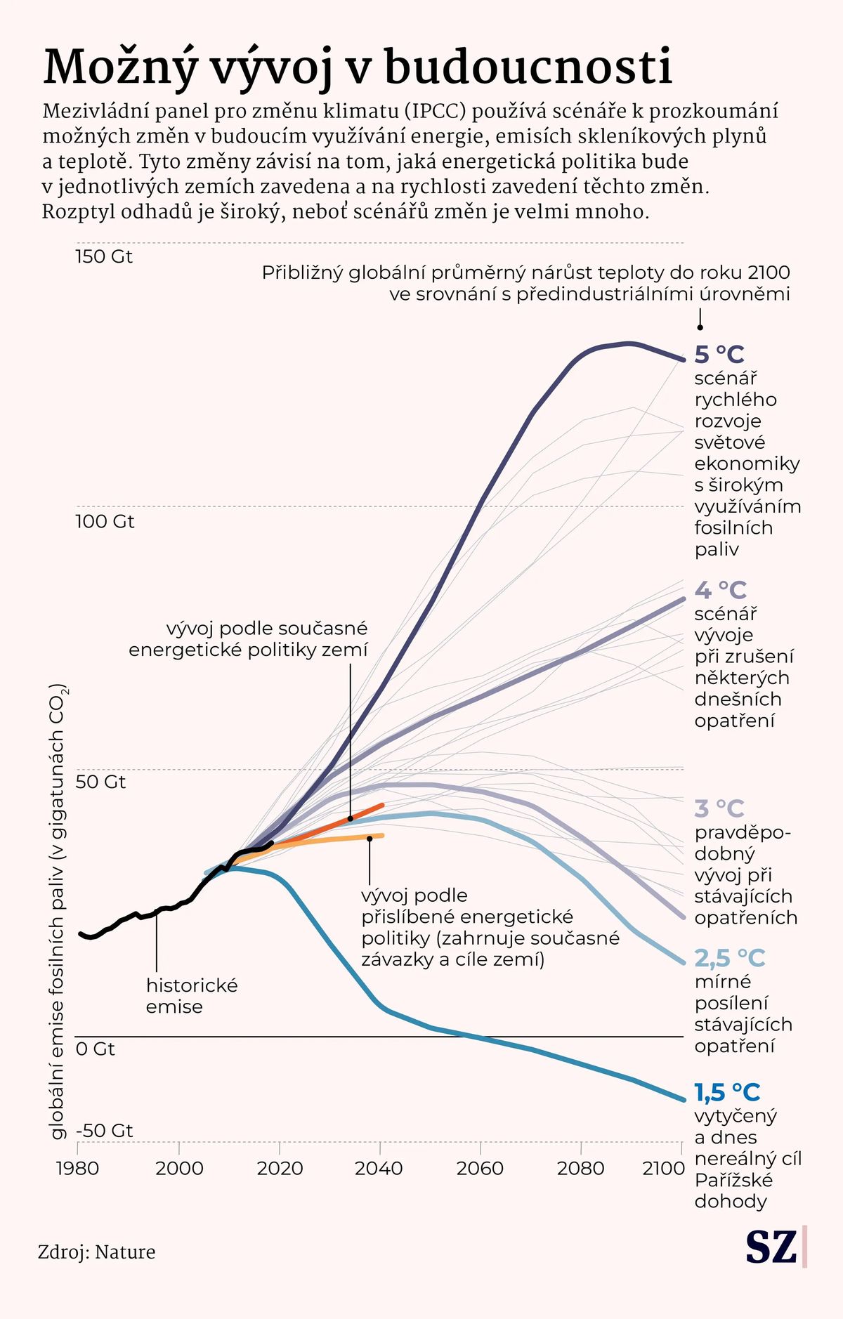 Přehled uvažovaných scénářů možného dalšího vývoje objemu emisí a vývoje světových teplot.