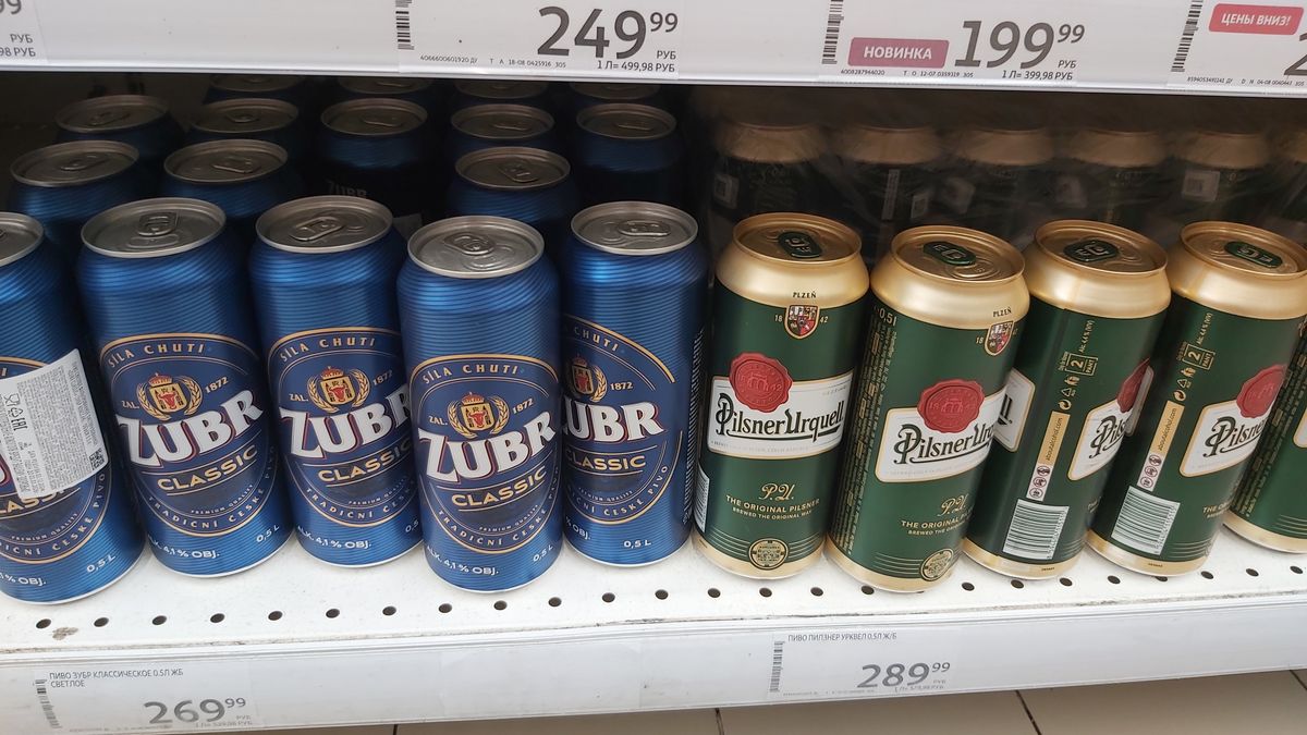 Nakonec třetí skupinu tvoří originální tuzemské značky. Navzdory zákazu dovozu do Ruska je jich poměrně dost. Černovar, Praga a Staročeské v půllitrových plechovkách stojí 239,99 rublů (přibližně 62 korun). Pivo Zubr přerovské výroby se prodává za 269,99 rublů (zhruba 70 korun).