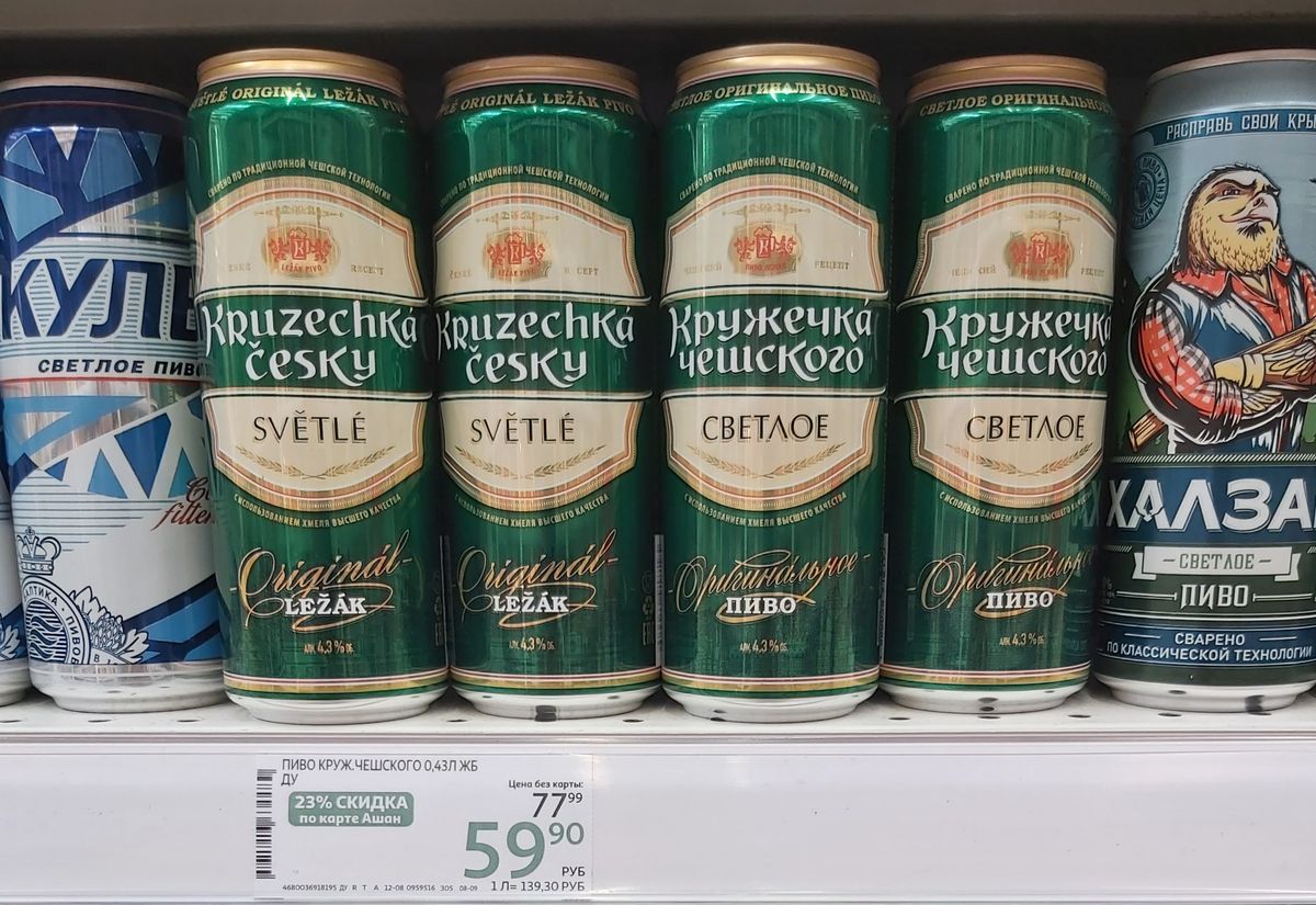 Pivo ruské výroby, které má vyvolat dojem, že pochází z Česka.