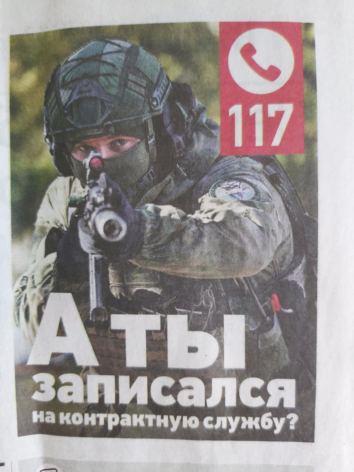 Obrovský billboard propagující náborovou akci. Na fotce dalšího vojáka v maskáčích je chytlavou červenou barvou vytištěna částka, kterou dostane každý, kdo se přihlásí do armády. Novinám vévodí dvoustránková reportáž z náborového centra. Muži různého věku stojí ve frontě, jen aby posloužili vlasti; maminky a manželky jim žehnají k nelítostnému boji s nepřítelem. Vedle reportáže zase svítí částka náborového příspěvku.