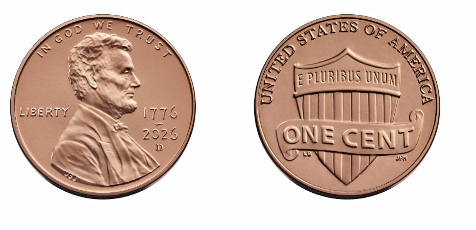 Rub a líc sběratelská penny s dvojitým datem „1776 – 2026“, na přední straně z profilu Abrahalm Lincoln.