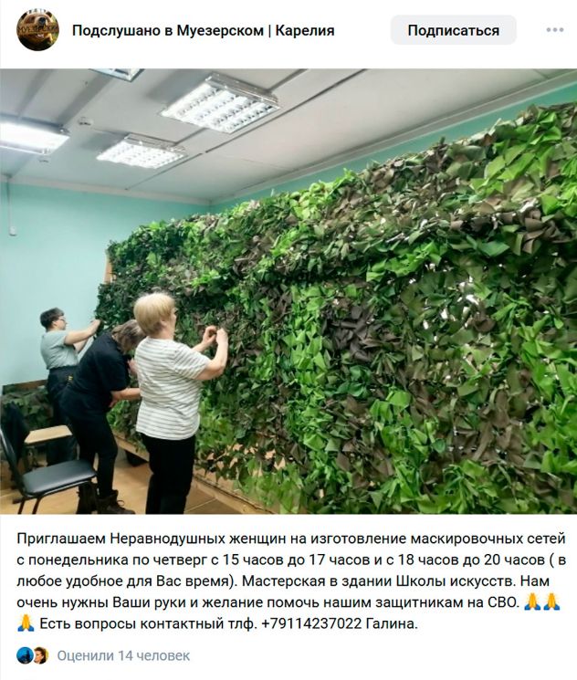 Mujezerská komunita se snaží pomáhat ruským vojákům ve válce. Každý týden se ve skupině na sociální síti VK oznamují setkání, kde se například tkají maskovací sítě pro frontu. Stejní dobrovolníci sbírají pro vojáky vlněné svetry, termoprádlo, termosky a čelovky.