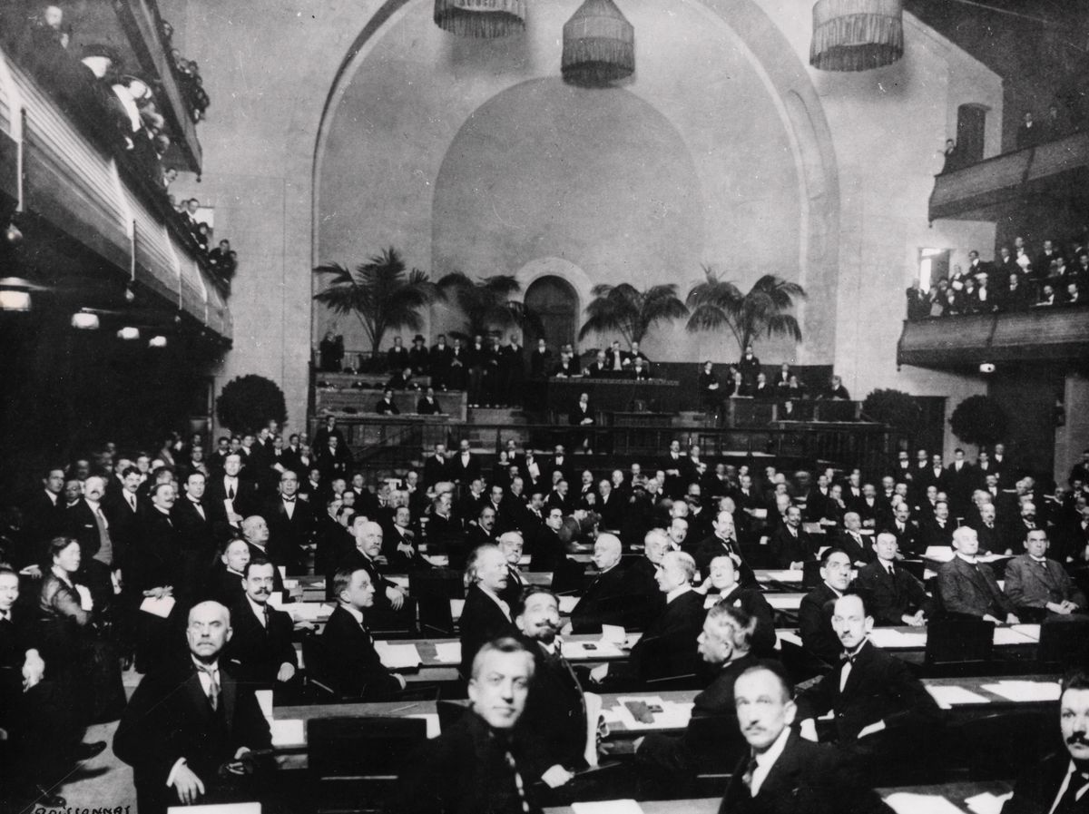 Historicky první zasedání Společnosti národů v Ženevě roku 1920.