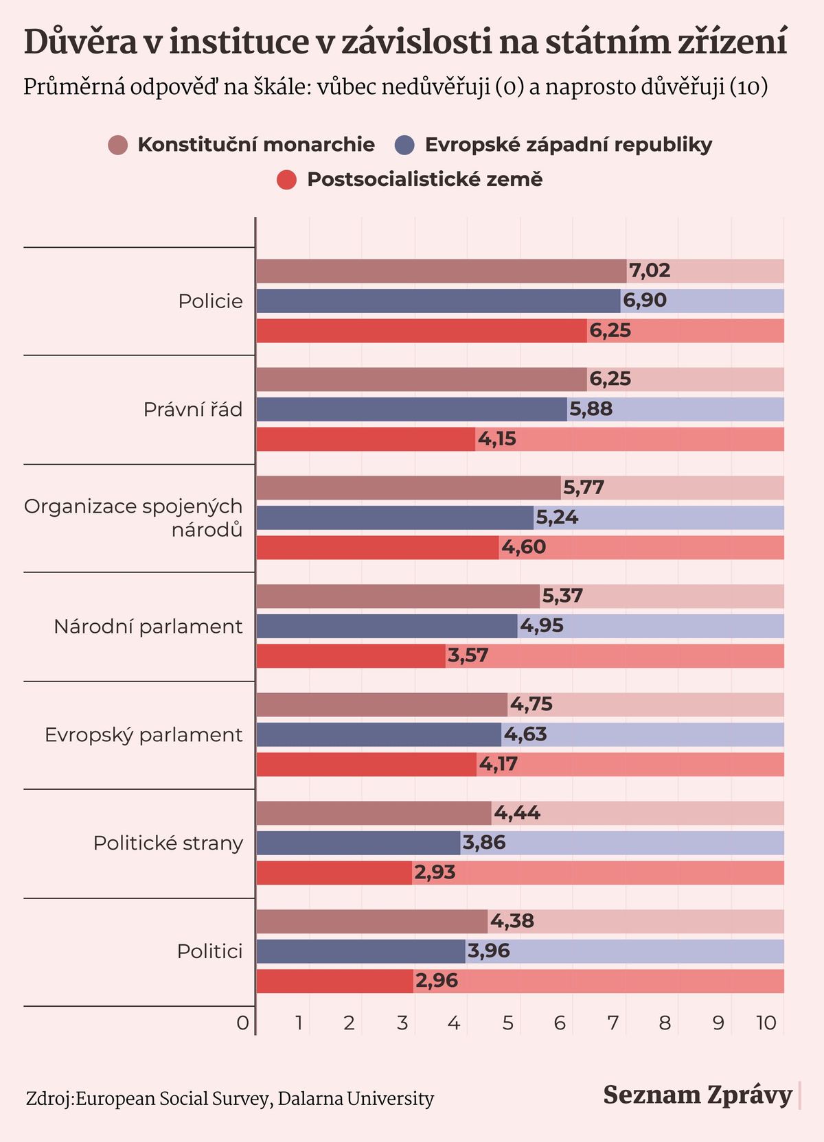 Studie švédské Dalarna University pak analyzuje data European Social Survey ohledně důvěry v instituce - včetně těch zcela bez jasného provázání se státním zřízením - v jednotlivých zemích a srovnává výsledky pro jednotlivá státní zřízení: evropské konstituční monarchie, západní republiky a postsocialistické státy.