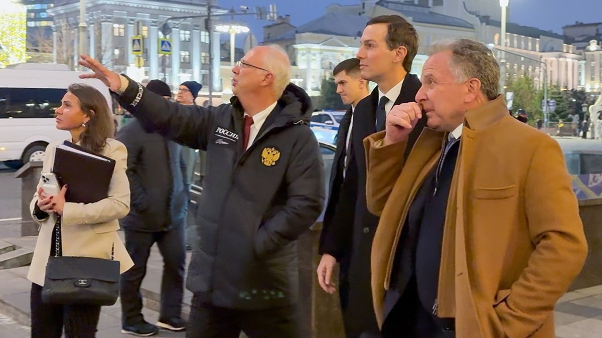 Kirill Dmitrijev, zeť Donalda Trumpa a podnikatel Jared Kushner a zvláštní vyslanec Steve Witkoff (zleva) během procházky centrem Moskvy.