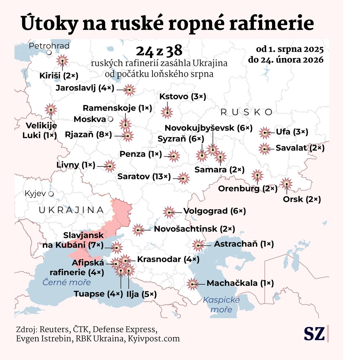 Export ropy a ropných produktů, jako je nafta a benzin, je přitom pro Rusko významným příjmem pro financování války. Když stát přijde o exportní příjmy, musí palivo dovážet, dotovat ceny, a roztáčí tak inflační spirálu. Zdraží dopravu, potraviny i výrobu. Zasažená tak není jen armáda, ale i běžné obyvatelstvo. To dělá útoky na energetické cíle strategicky daleko účinnější.