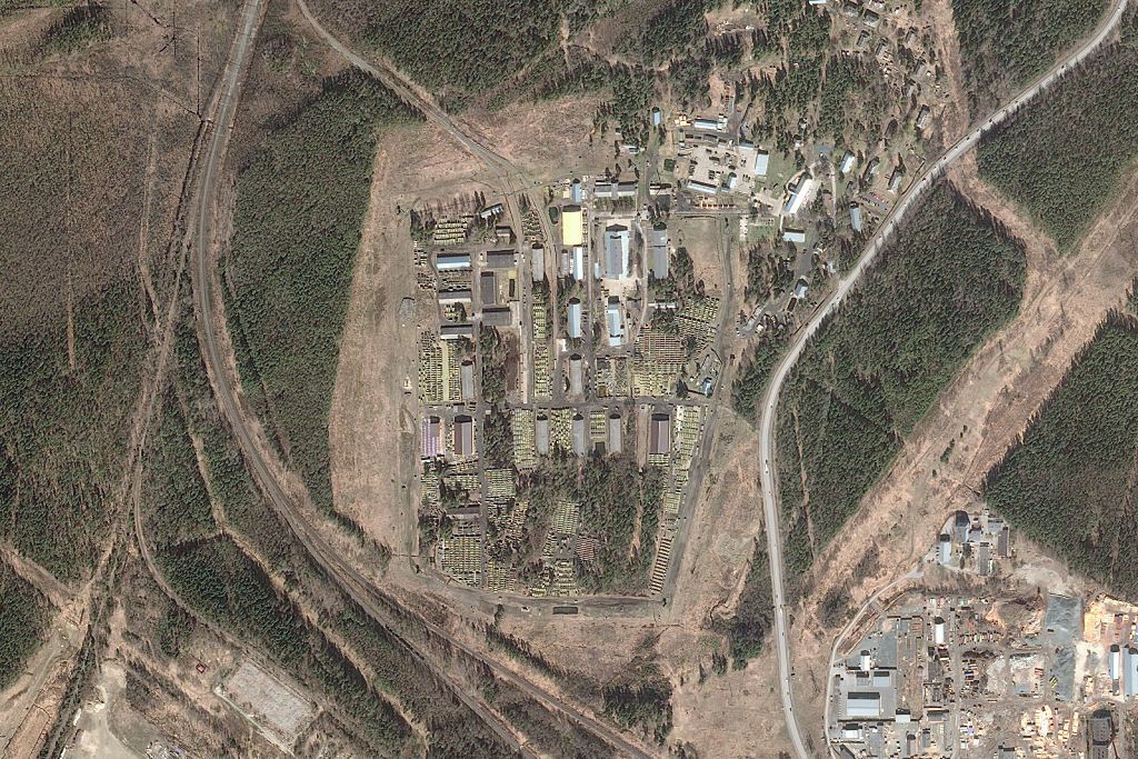 Satelitní snímek vojenské základny Rybka u Petrozavodsku. Na fotce jsou viditelné budovy pro uskladnění vojenské techniky. Snímek byl pořízen 8. května 2025.