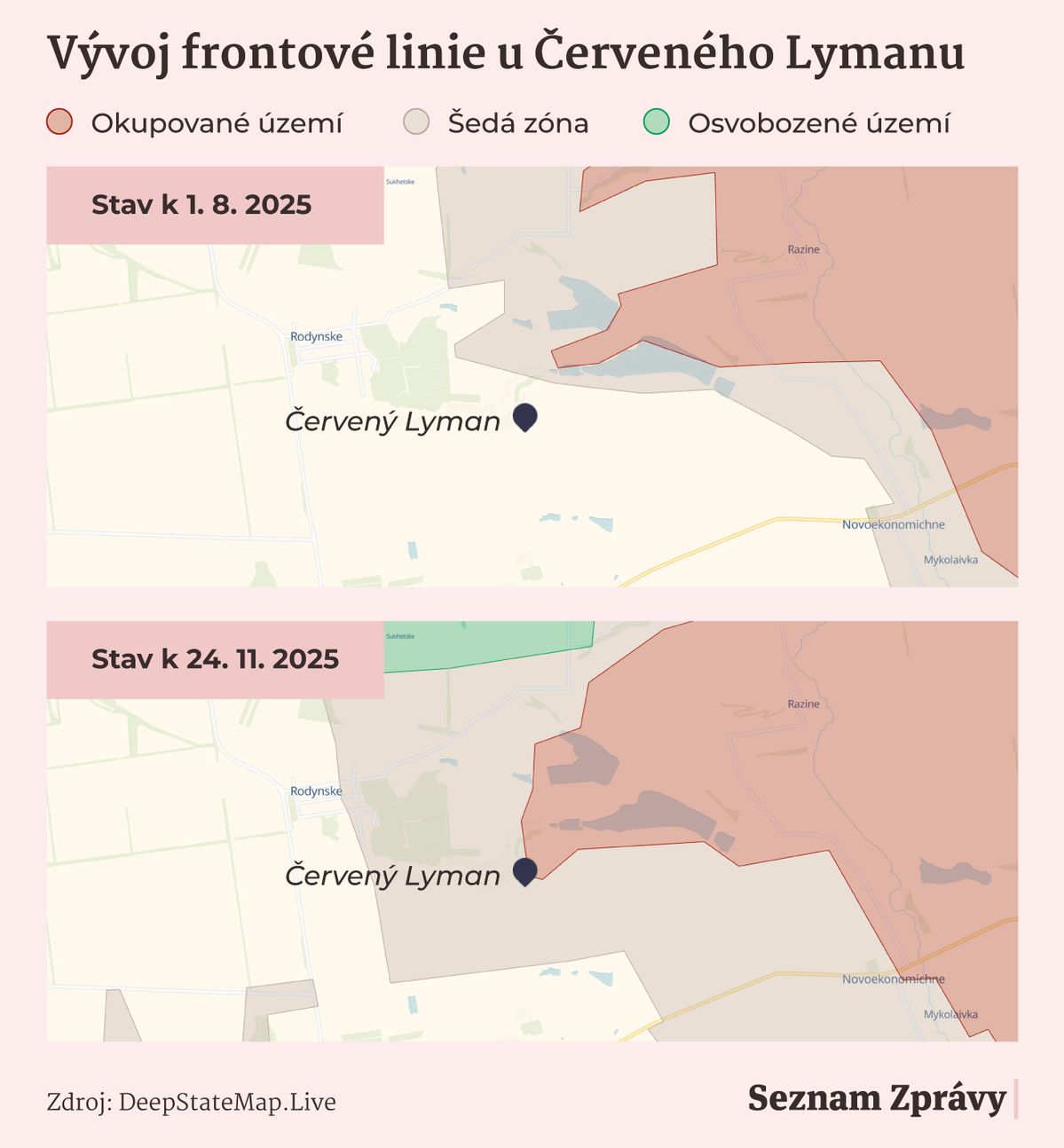 Úsek fronty u vesnice Červený Lyman v současnosti fakticky zamrzl. Ruští okupanti se v tomto místě zasekli už v létě kvůli ukrajinské efektivní defenzivě – srpnový ruský výpad v oblasti ukazují i mapové vizualizace na ukrajinském serveru Deep State, který dlouhodobě poměrně spolehlivě sleduje vývoj ruské invaze.