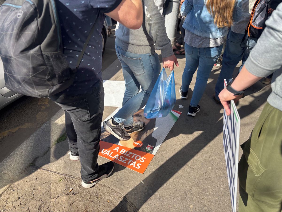 Na Deákově náměstí příznivci Tiszy šlapali po strhnutém volebním plakátu strany Fidesz.