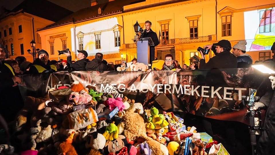 Za organizace Magyarovy strany Tisza pochodovaly v sobotu desetitisíce lidí se svícemi a pochodněmi před kancelář premiéra a k sídlu prezidenta Tamáse Sulyoka na Budapešťský hrad. Na místě lidé pokládali dětské hračky, na stěny se promítaly dětské kresby.