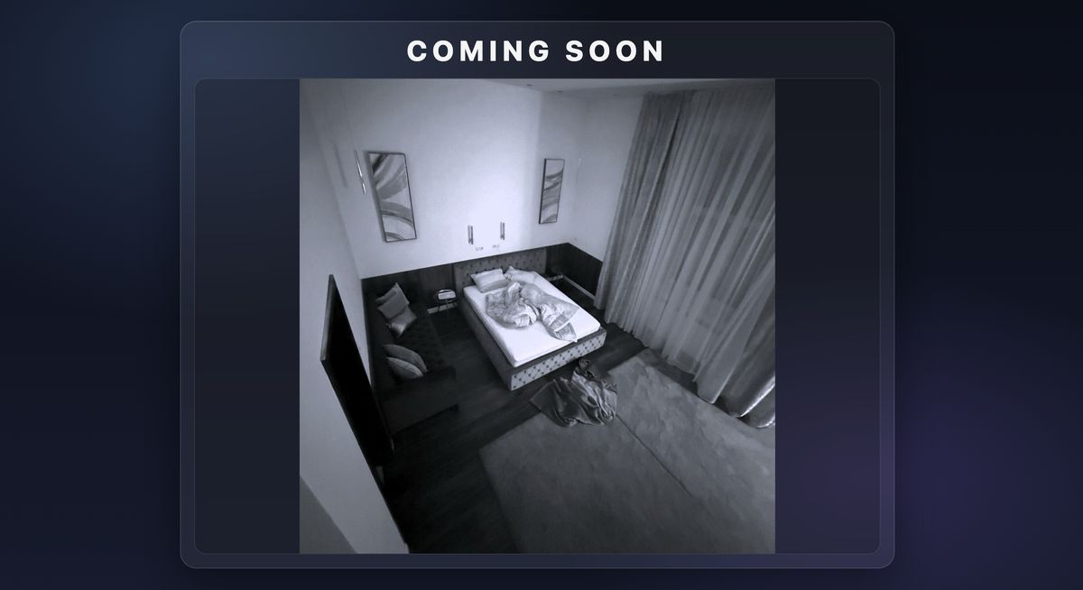 Místnost spíš než domácí ložnici připomíná hotelový pokoj. Nad snímkem je anglický nápis „Coming soon“, tedy „již brzy“.
