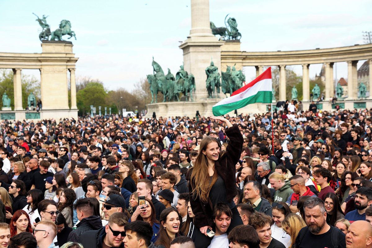 Náměstí pak skandovalo jeho jméno i hesla jako „Špinavý Fidesz“, „Rusové domů“ nebo „Konec je tu“.