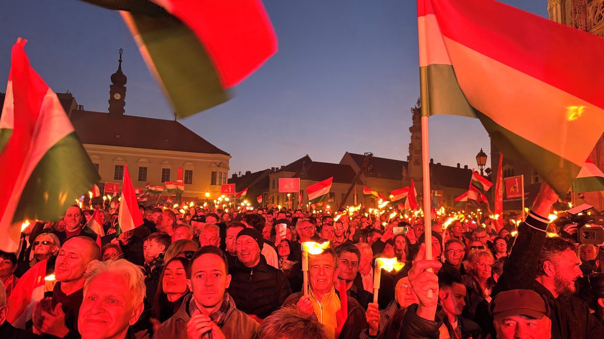 Lídr opozičního hnutí Tisza Péter Magyar tou dobou v Budapešti nebyl. Mluvil na mítinku v Miskolci, kde se mu podařilo zaplnit náměstí.