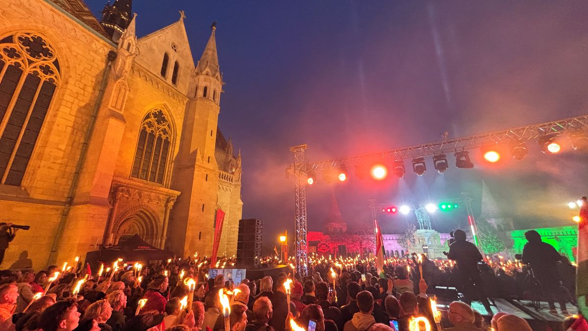 O pár kilometrů dál, na náměstí Hrdinů, se už v té době desetitisíce lidí houpaly do rytmu hudby, která slibovala „zbořit systém“. Zněly desítky protestních songů i politických projevů namířených proti vládnoucí straně Fidesz Viktora Orbána.