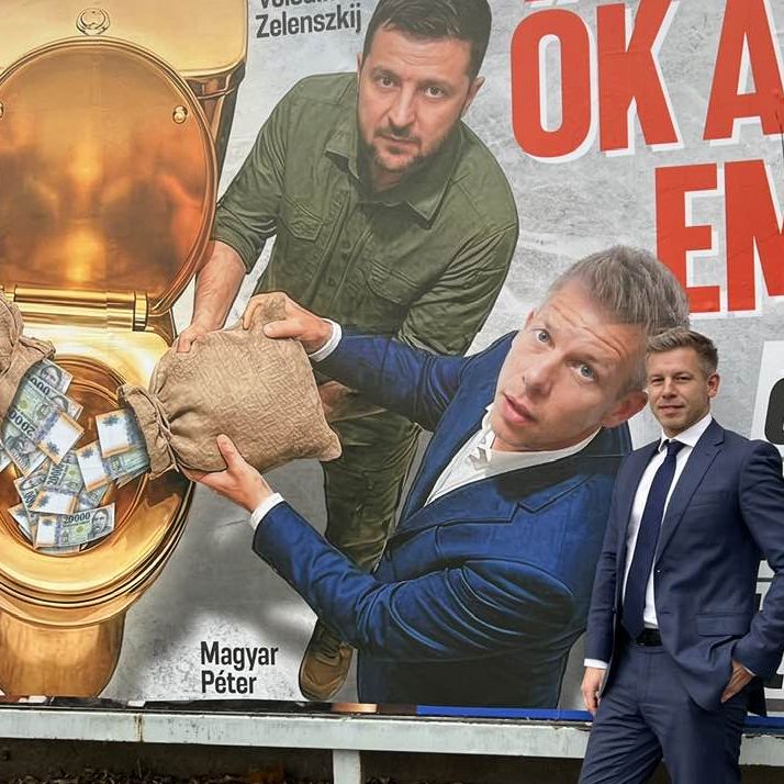 Fidesz oblepil zemi propagandistickými billboardy, na nichž Magyar, ukrajinský prezident Volodymyr Zelenskyj a šéfka Evropské komise Ursula von der Leyen vysypávají pytle s penězi do zlatého záchodu. Magyar se u plakátu recesisticky vyfotil a snažil se útok zesměšnit.