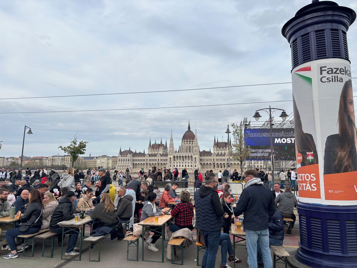 Po výstupu z metra se jim otevřel přímý pohled na budovu parlamentu. Právě tu si jako kulisu pro svůj večerní projev vybral lídr Tiszy Péter Magyar. Volební štáb hnutí se usadil na nábřeží přímo naproti Országházu - maďarské sněmovny.