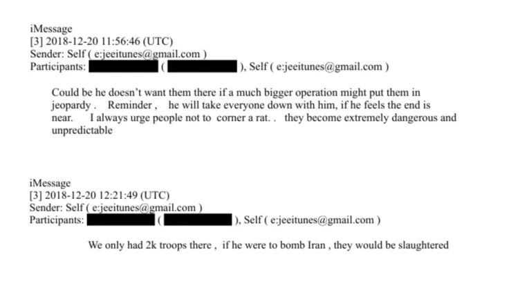 Podle přepisu komunikace z prosince 2018 Epstein psal neznámému kontaktu krátce poté, co Trump nečekaně oznámil stažení amerických vojáků ze Sýrie. V konverzaci naznačoval, že tento krok může být přípravou na větší vojenskou operaci a že prezident by mohl v krajním případě „bombardovat Írán“.