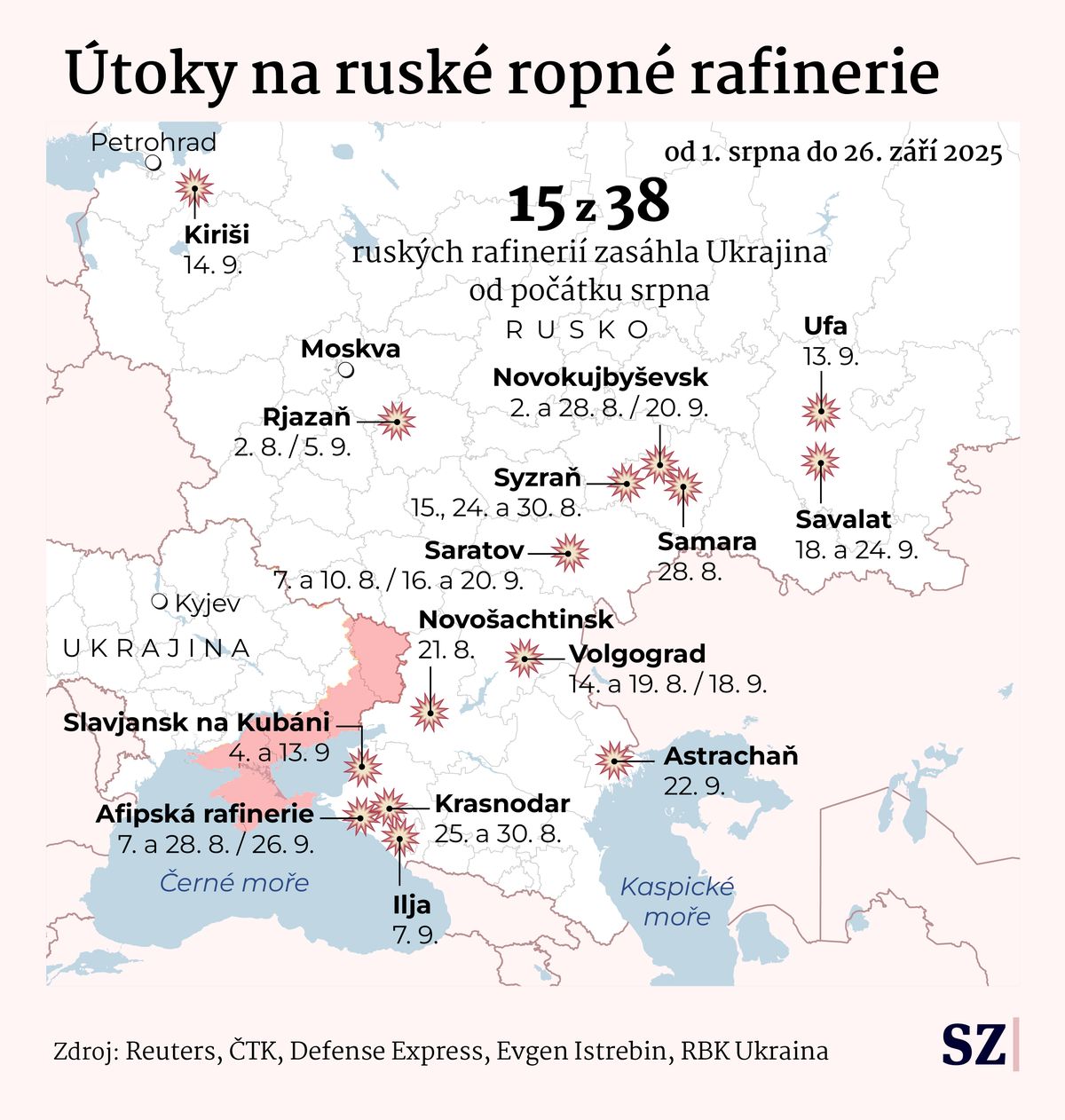 V rámci ukrajinské kampaně zasažené ruské rafinérie k 26. září 2025
