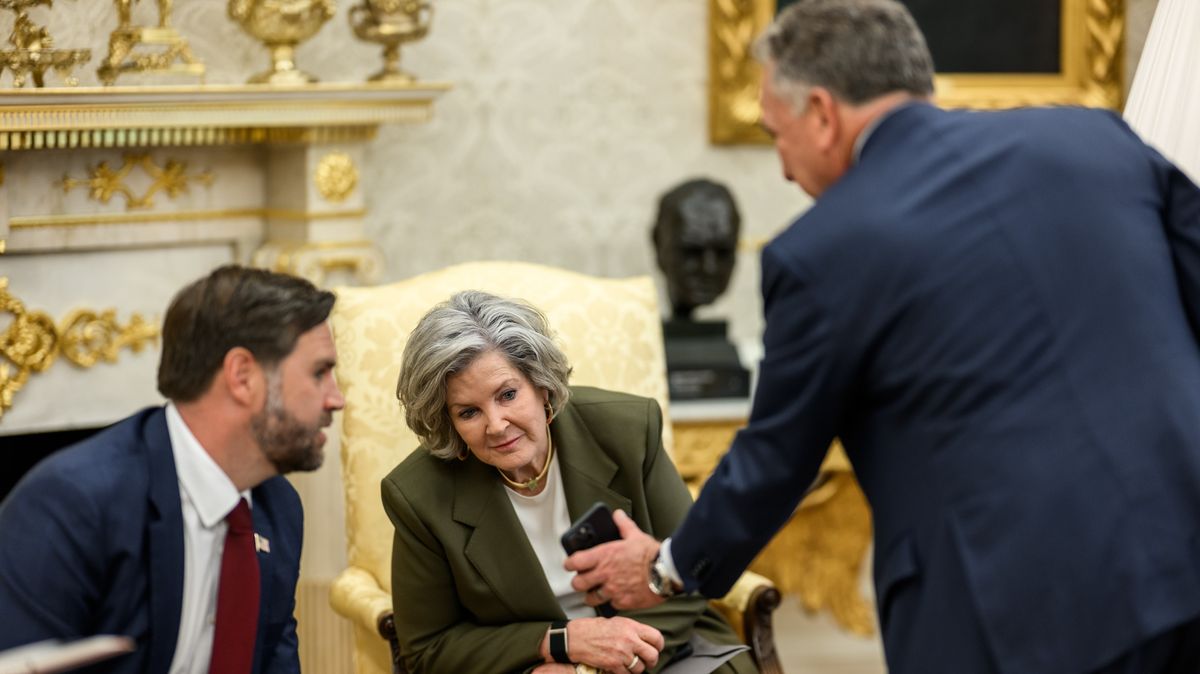 Susie Wilesová, J. D. Vance a zvláštní vyslanec Steve Witkoff v Oválné pracovně, 29. září 2025 během návštěvy izraelského premiéra Benjamina Netanjahua.