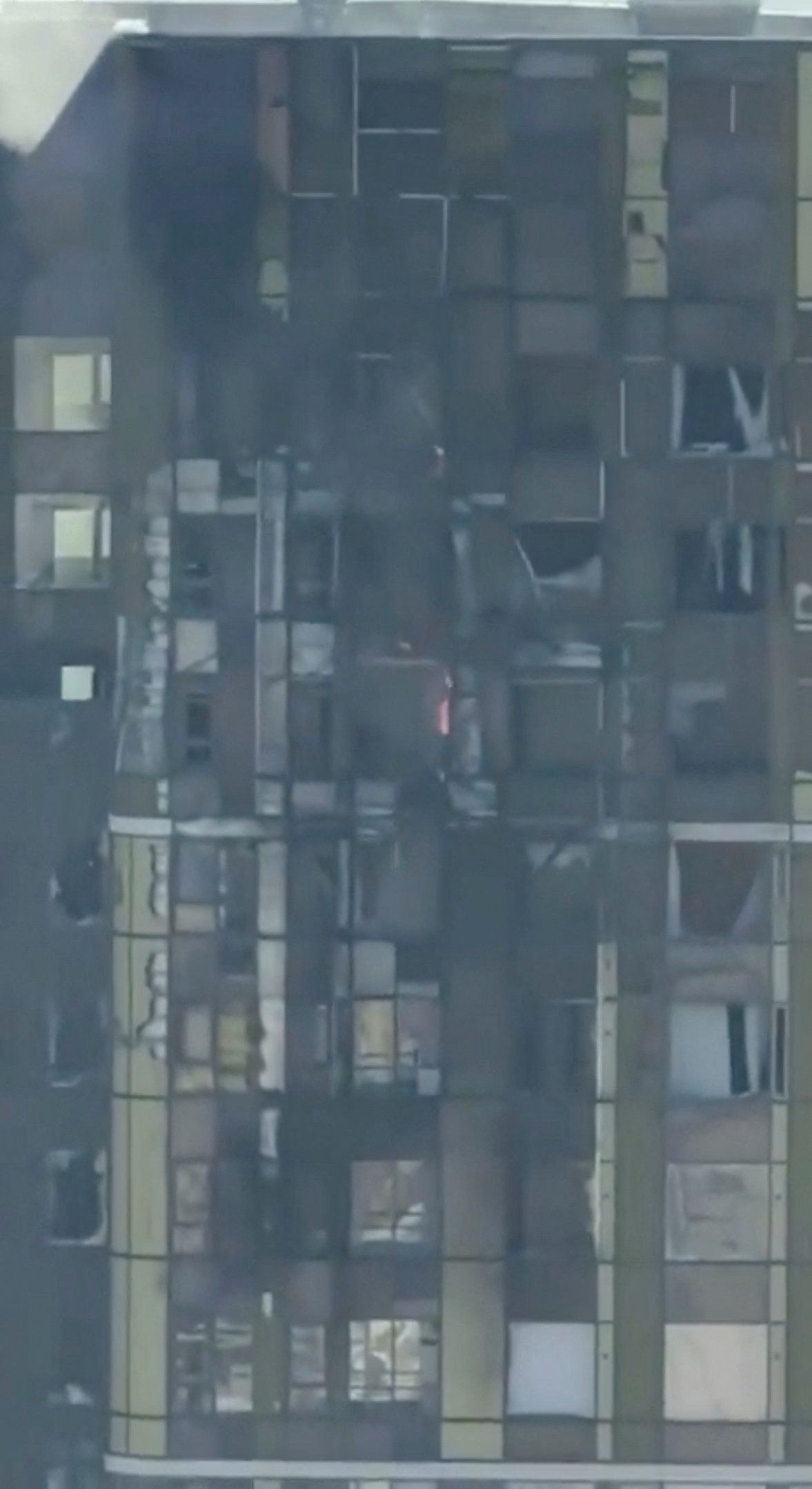 Video zveřejněné na sociální síti X ověřené agenturou Reuters ukazuje dým vycházející ze střechy moderní výškové budovy.