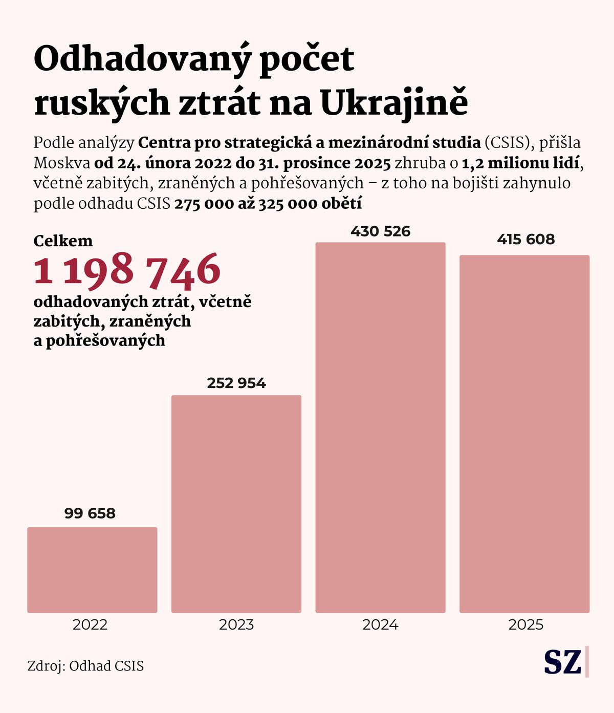 Odhad ruských ztrát na Ukrajině v letech 2022 až 2025 podle analýzy Centra pro strategická a mezinárodní studia (CSIS).