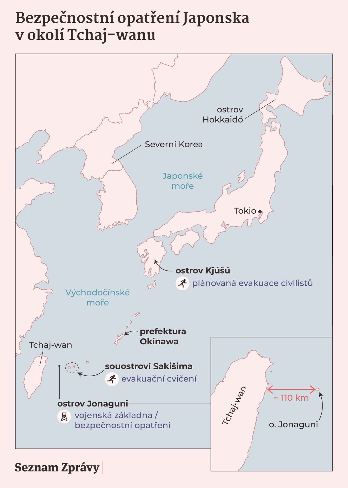 Tokio proto loni představilo plány na evakuaci více než 100 tisíc civilistů z některých odlehlých ostrovů poblíž Tchaj-wanu. Do operace by byly zapojeny lodě i letadla, které by měly zajistit přesun obyvatel i turistů do bezpečnějších částí Japonska.