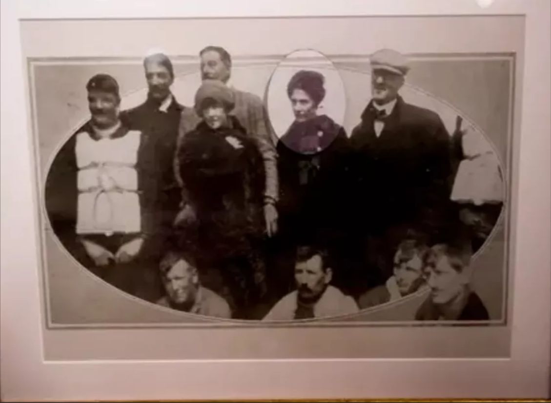 Dobová fotografie části přeživších potopení Titanicu. Původní majitelka záchranné vesty Laura Mabel Francatelliová v kroužku.