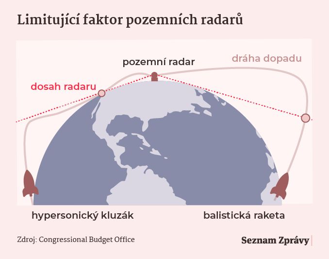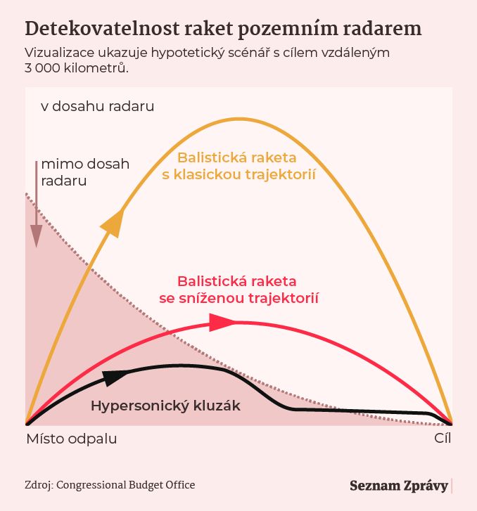 Hypersonický kluzák je ve srovnání s balistickou raketou radarem „spatřen“, až když je podstatně blíž k cíli.