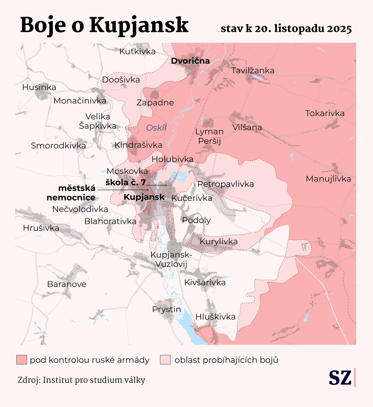 Přibližná situace v Kupjansku k 20. listopadu 2025.