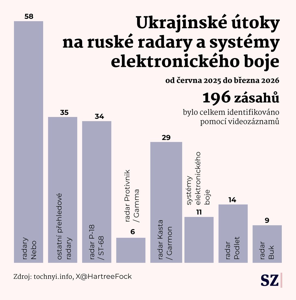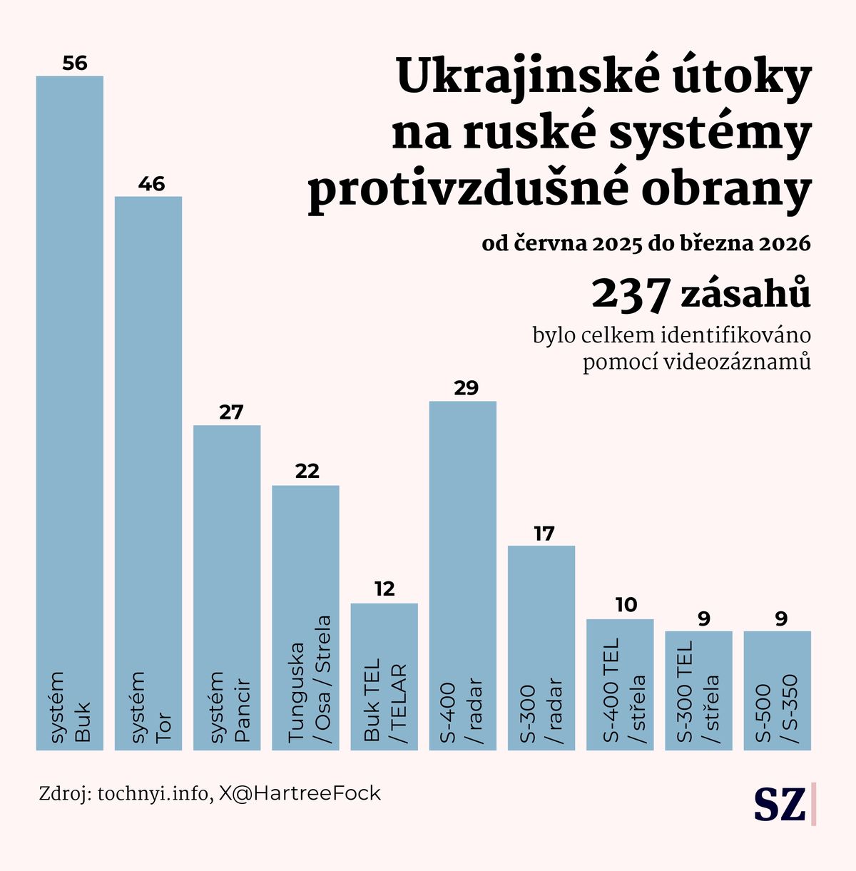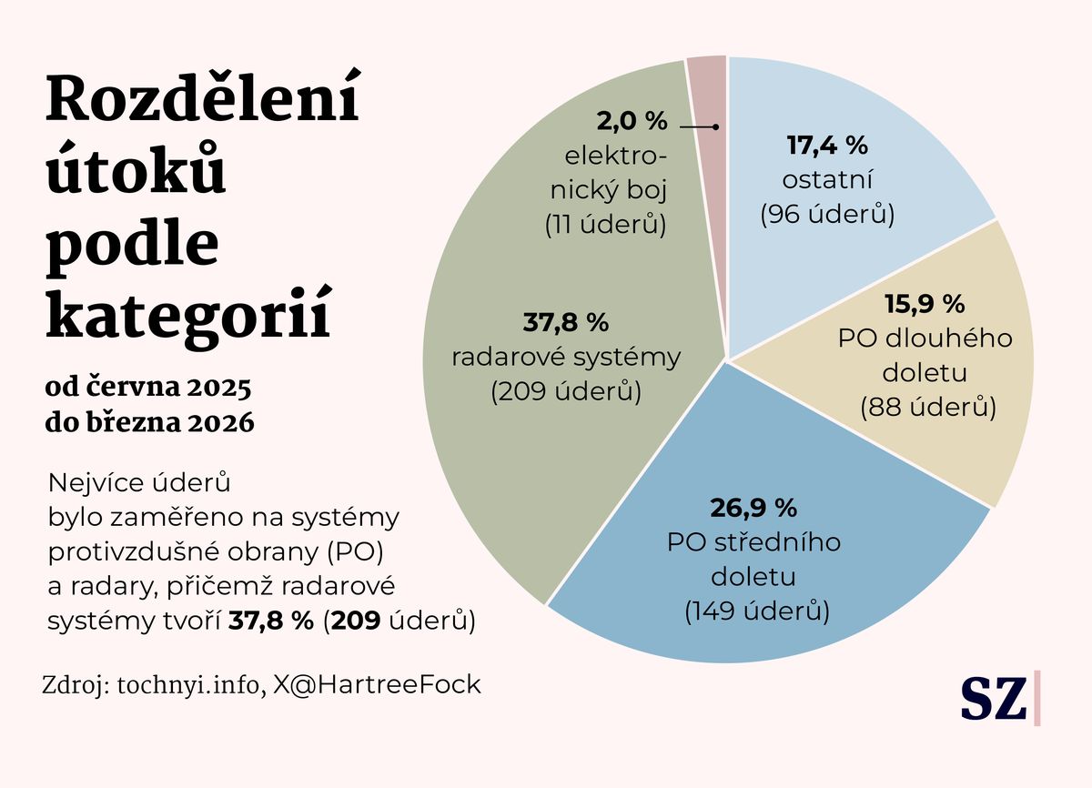 Z 433 potvrzených úderů na systémy PVO připadalo 37 procent na radary, zbytek na odpalovací zařízení středního i dalekého dosahu — od systémů Buk a Tor po S-300 a S-400.