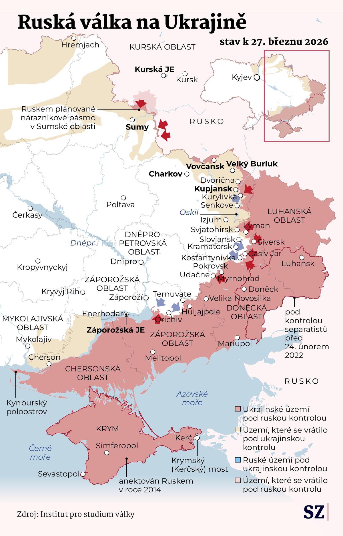 Začněme u severní fronty, o které jsme delší dobu nemluvili. Podél mezinárodně uznávané hranice od Sum přes Charkov po Velký Burluk pokračuje ruský tlak na několika úsecích.