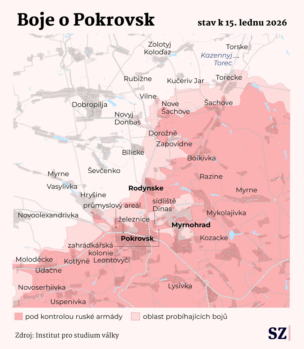 Přibližná situace na pokrovském úseku fronty k 16. lednu 2026.