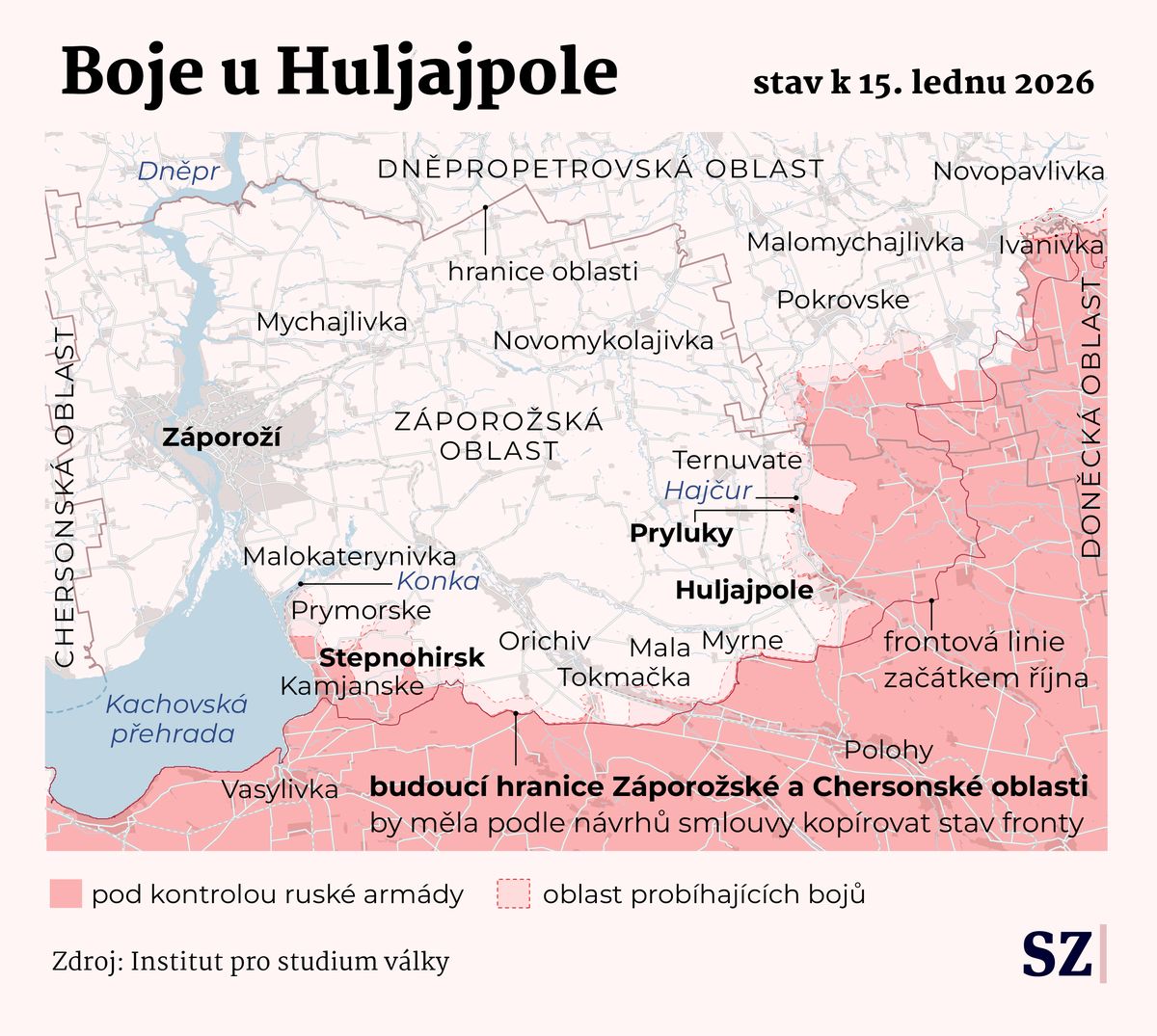 Přibližná situace u Huljajpole k 16. lednu 2026.