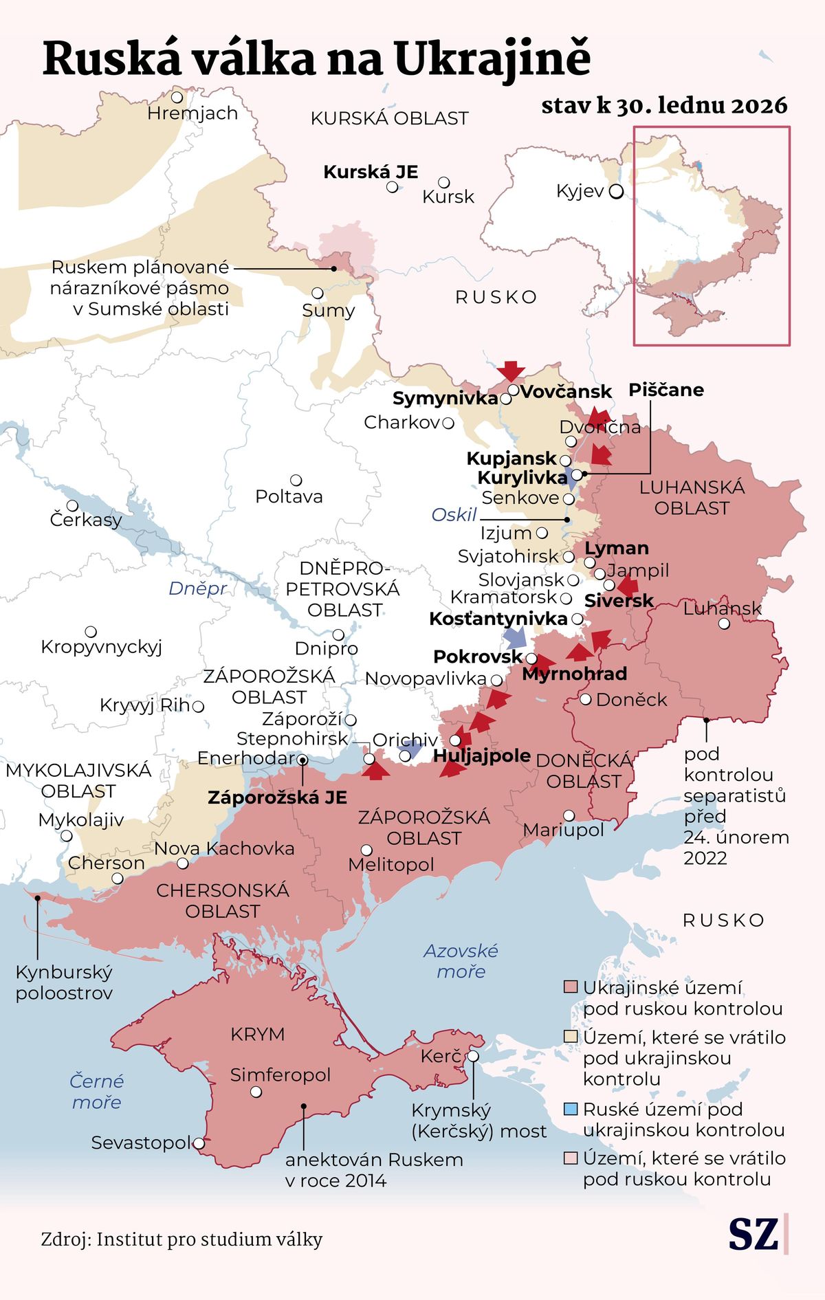 Přibližný stav linie fronty v rusko-ukrajinské válce k 30. lednu 2026