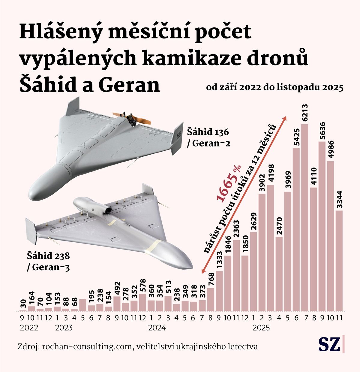 Druhý klíčový faktor změny popisuje polský analytik Konrad Muzyka ze společnosti Rochan Consulting. Rusko v roce 2025 upustilo od dřívější taktiky masivních salv 90–120 raket najednou. Místo toho přešlo na koncept, ve kterém jsou útoky častější, ale skládají se z obrovských hejn (relativně) levných, a hlavně ve velkém počtu dostupných dronů, v nichž je skryto menší množství (30–70) vysoce přesných střel.