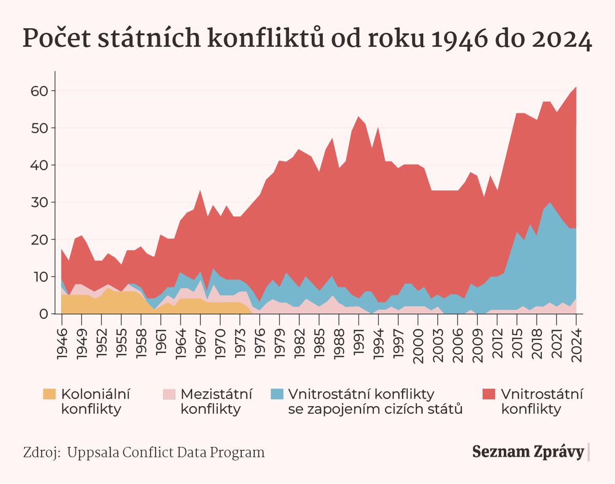 V roce 2025 analytici napočítali po celém světě celkem 59 aktivních státních konfliktů, což je o tři víc než v roce 2024, takže i podle jejich nejaktuálnější databáze platí, že válek je nejvíc od konce druhé světové války.